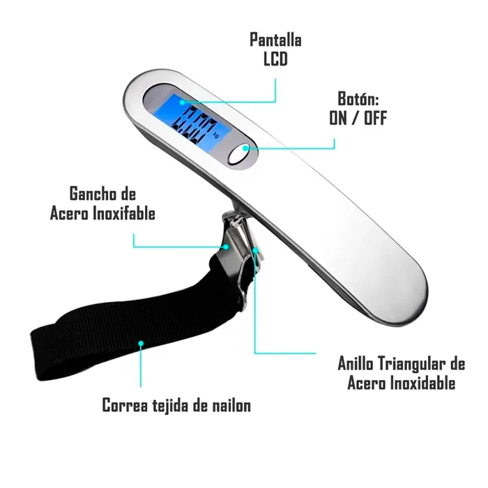 Con esta báscula portátil para equipaje podrás pesar tu maleta fácilmente antes de salir de casa. Su diseño compacto y liviano te permite llevarla cómodamente en tu bolso de mano o mochila de viaje.